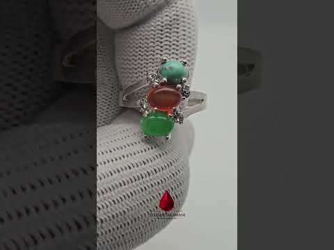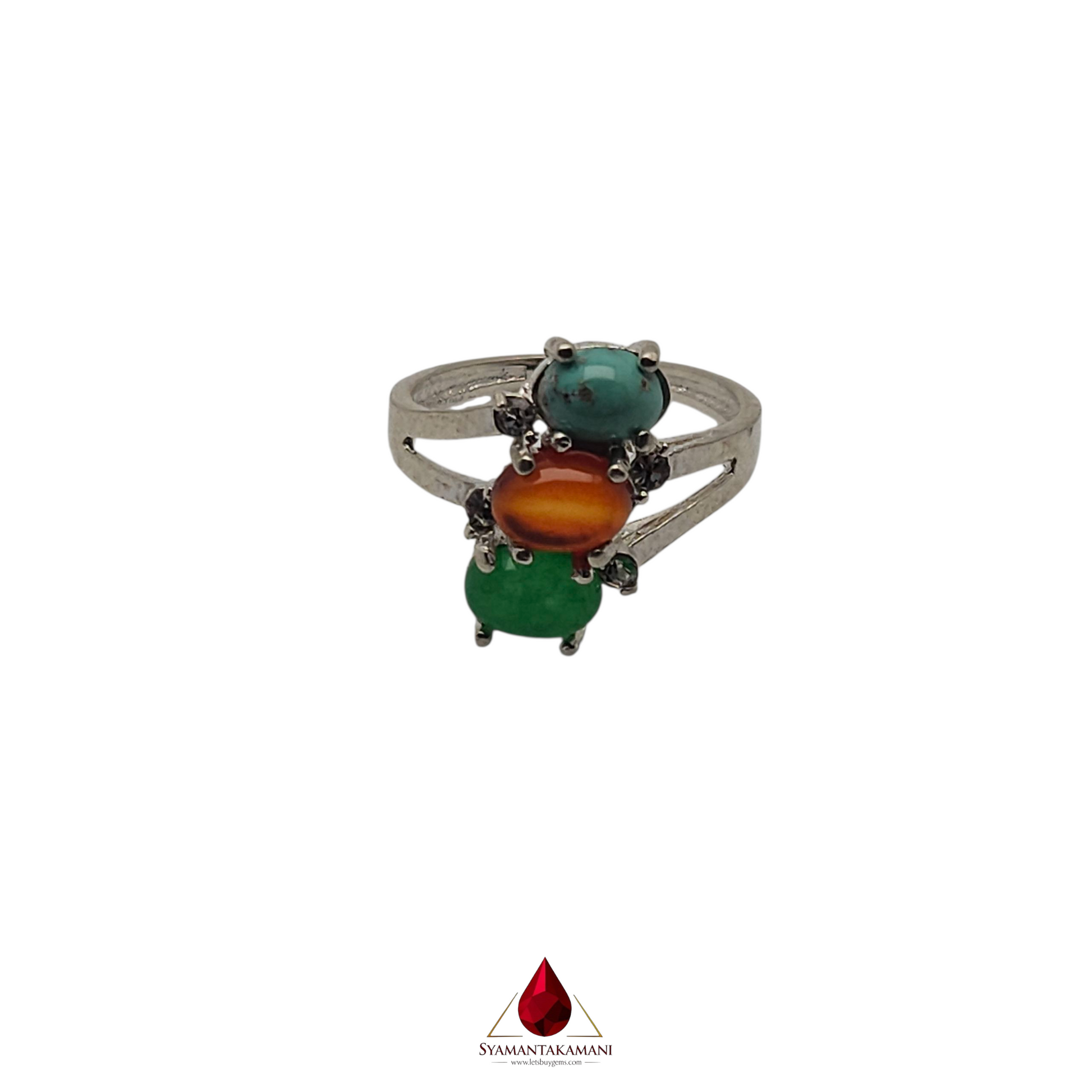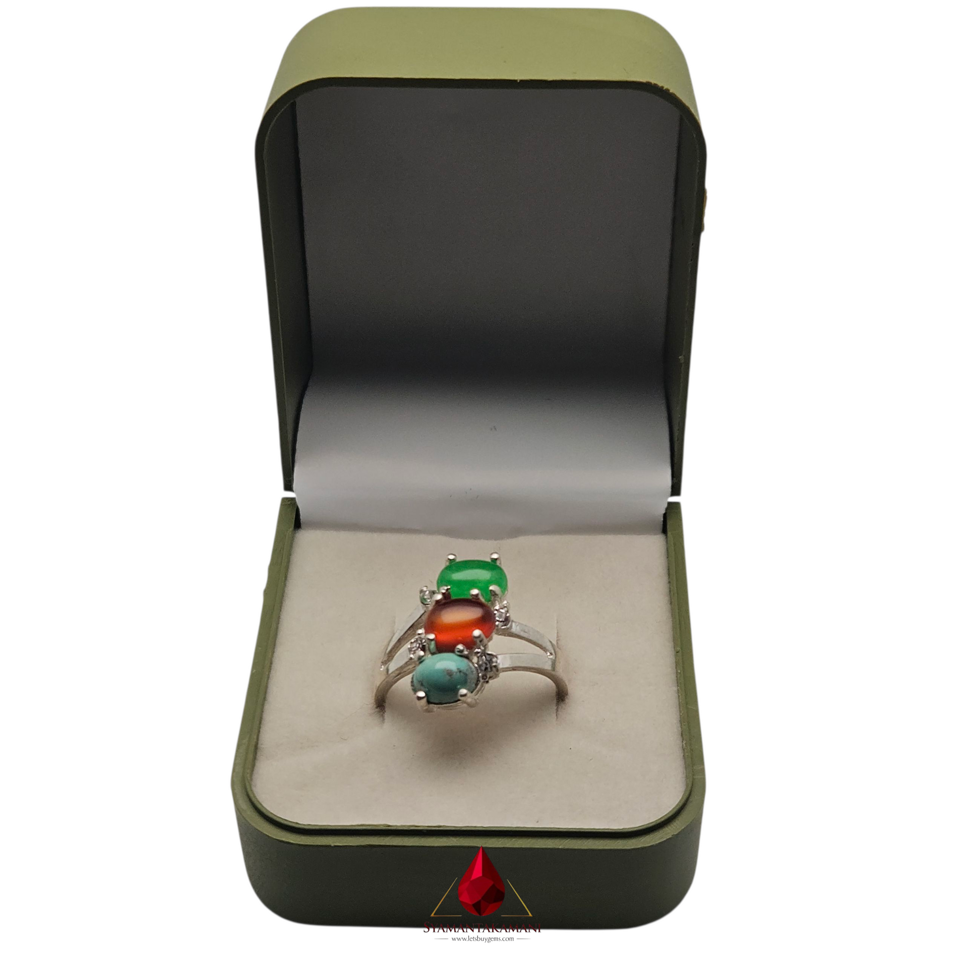Introducing the 3P Sterling Silver Ring, a sleek and meaningful piece designed to be your daily talisman of Power, Prosperity, and Protection. This elegant ring features three small, vibrant, natural gemstones set in a modern, dazzling American Diamond (AD) accent setting crafted from high-quality 925 Sterling Silver.