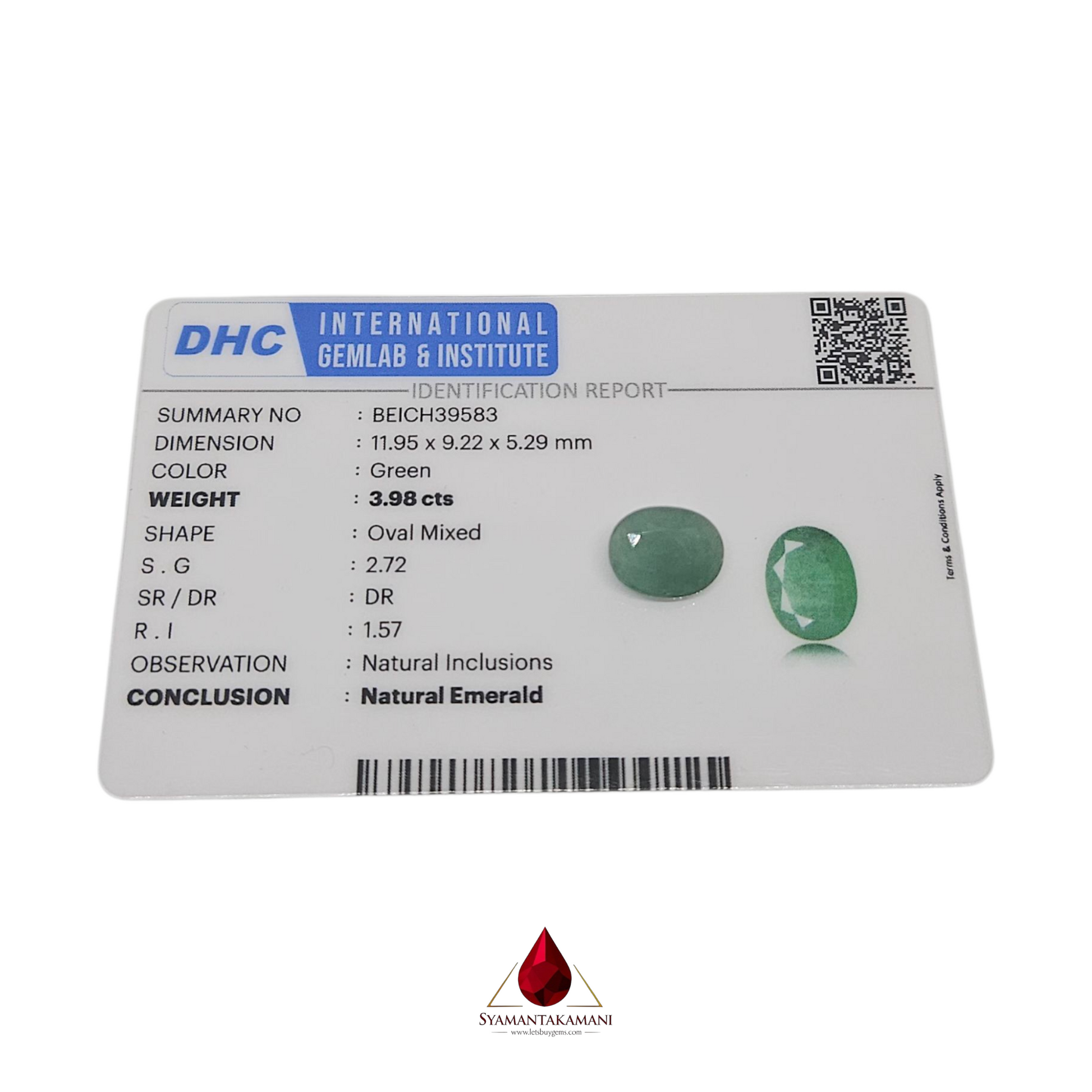 Presenting a spectacular 3.98-carat natural Emerald, a gem that embodies prestige and verdant splendor. This oval mixed-cut gemstone, with impressive dimensions of 11.9mm x 9.2mm x 5.3mm, is a powerful example of one of the world's most desired jewels.