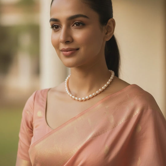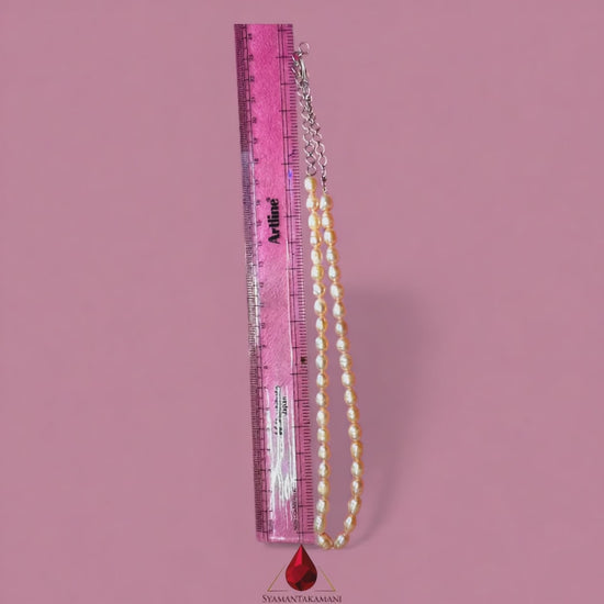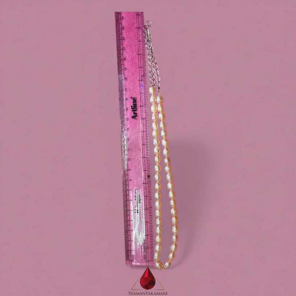 Adorn yourself with the timeless elegance of this exquisite necklace, featuring sIngle line of lustrous peach/rose colour 7mm oval natural cultured freshwater pearls.