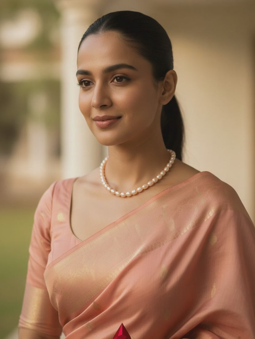 The perfectly oval pearls, with its captivating natural elegant peach to rose gold hue, is a symbol of class and luxury. Oval pearls above 7mm size is a statement by itself, consider wearing to this timeless beauty. This piece carries a certificate for the pearls used issued by BGTL, verifiable online and accepted globally.